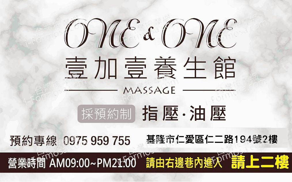 商家介紹壹加壹養生館 位於基隆市仁愛區仁二路,就在愛五路和愛四路這兩個路口之間的路段上。附近地點有基隆廟口夜市。 這裡提供服務有 全身按摩、肩頸按摩、背部按摩、指壓、油壓、泰式按摩、台式按摩、中式按摩、經絡按摩、中式推拿、精油按摩、芳療SPA。 精選照片 商家資訊 仁愛區 所在位置: 台灣 > 北台灣 > 基隆市 > 仁愛區 商家類型: 養生會館 統一編號: 87326905 商業登記名稱: 壹加壹養生館 商家地址: 200台灣基隆市仁愛區仁二路194號2樓 登記營業項目: JF01040 經絡調理業 JZ99990 未分類其他服務業 ZZ99999 除許可業務外,得經營法令非禁止或限制之業務 預約方式: 請先預約 聯絡電話1: 02-24280016 聯絡電話2: 0975959755 Facebook : 上午 9:00 - 下午 9:00週一上午 9:00 - 下午 9:00週二上午 9:00 - 下午 9:00週三上午 9:00 - 下午 9:00週四上午 9:00 - 下午 9:00週五上午 9:00 - 下午 9:00週六上午 9:00 - 下午 9:00週日Closed 服務項目: 全身按摩肩頸按摩背部按摩指壓油壓泰式按摩台式按摩中式按摩經絡按摩中式推拿精油按摩芳療SPA 付款方式: 現金 停車位: 路邊停車付費停車場 店家其他照片(1) 店家其他照片(2) 地圖位置 地圖導航 No Records FoundSorry, no records were found. Please adjust your search criteria and try again. Google Map Not LoadedSorry, unable to load Google Maps API. Google評論 5.0powered by Google林基益11:32 09 Feb 25超棒第一次去按 回去很容易入睡 感覺放鬆很多簡振峰15:37 09 Nov 23師父服務好。氣結都有推開 感覺舒服多了Jan de Vries18:30 11 Feb 23Doris yu11:35 08 Oct 22老闆娘人很實在也很親切👍👍按摩技術非常厲害!按到一些經絡很痛,但按完全身很放鬆❤️推推👍嵐ㄦ16:24 27 Jul 22闆娘跟妹妹服務很好,聊天也開心技法舒服讓人放鬆,推推)))Chumg-Wen Wu12:55 12 Nov 20按摩很專業,力道夠足,環境也很好,價錢也公道,唯一不足是不好停車。Chang Lee16:06 19 Aug 20新開幕的指油壓按摩店,裡面師傅年輕有力道,又健談,環境溫馨讓人很放鬆,很適合夫妻同行 標籤: 中式按摩、中式推拿、全身按摩、台式按摩、基隆市仁二路、基隆市仁愛區按摩、基隆市愛五路、基隆市愛四路、基隆廟口夜市、基隆按摩、指壓、油壓、泰式按摩、精油按摩、經絡按摩、肩頸按摩、背部按摩、及 芳療SPA