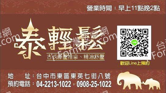 商家介紹泰輕鬆泰國古式養生會館-東英店 位於台中市東區東英七街,就在一心街和長福路這兩個路口之間的路段上。附近地點有聖母橋。 這裡提供的服務有 全身按摩、腳底按摩、肩頸按摩、背部按摩、指壓、油壓、泰式按摩、泰式古法、經絡按摩、精油按摩、足湯、芳療SPA、泰式SPA、被動式瑜伽、踩背。 精選照片 商家資訊 東區 所在位置: 台灣 > 中台灣 > 台中市 > 東區 商家類型: 養生會館 統一編號: 82609067 商業登記名稱: 泰輕鬆養生會館 商家地址: 401台灣台中市東區東英七街8號 登記營業項目: JF01010 傳統整復推拿業 JF01020 按摩業 預約方式: 預約或現場都可 聯絡電話1: 04-22131022 聯絡電話2: 0908251022 Facebook Instagram : 上午 11:00 - 上午 2:00週一上午 11:00 - 上午 2:00週二上午 11:00 - 上午 2:00週三上午 11:00 - 上午 2:00週四上午 11:00 - 上午 2:00週五上午 11:00 - 上午 2:00週六上午 11:00 - 上午 2:00週日上午 11:00 - 上午 2:00 服務項目: 全身按摩腳底按摩肩頸按摩背部按摩指壓油壓泰式按摩泰式古法經絡按摩精油按摩足湯芳療SPA泰式SPA被動式瑜伽踩背 服務設施: 布簾隔間 付款方式: 現金 停車位: 路邊停車付費停車場 店家其他照片(1) 店家其他照片(2) 地圖位置 地圖導航 No Records FoundSorry, no records were found. Please adjust your search criteria and try again. Google Map Not LoadedSorry, unable to load Google Maps API. Google評論 4.8powered by GoogleSummer03:57 14 Sep 25大概一季會去按一次 按了六七年師父的素質真的都很不錯但是真的希望你們的毛巾可以好好的送洗從1200按到1600 也都有漲價了是不是就不要都自己洗說毛巾曬不乾因為我從來沒有用過乾爽的毛巾鋪在床墊上的都是有點冷冷濕濕跟臭味尤其一條小毛巾放在臉上真的會被臭爛臭爛的意思就是躺在那邊會一直無法放鬆因為師父手法都不錯還是會持續去按但是毛巾拜託可不可以維持一下那個品質會更好 感恩蘇美英18:02 10 Sep 25很放鬆的好地方師傅們也都很親切Han yu07:02 24 Aug 25很舒服🥹真的應該按兩個小時環境很好 按摩真的舒服的沒話說闆娘很親切~收藏名單Micha Liu06:14 24 Aug 25有一說一,來這間店應該不下5-6次,前面幾次都不錯,漲價也沒關係(油壓1700/2小時)維持品質就好,但最近一次感受上蠻差的,換裝、拿毛巾的時間真的太久,稍微睡著後就用摸的,提醒大力一點,但也只有剛開始用力後面還是一樣,轉正面後,繼續摸只有眼睛張開的時候才比較認真按,覺得按完完全沒有放鬆到,真的有點失望。但目前樂業店經驗上還是不錯的,以上。古泉(泉)13:43 02 Aug 2555、77技術很好,按完非常舒服放鬆有舒壓到的感覺!有機會會再回訪👍紅羊12:49 27 Apr 25跟老婆第一次來老闆娘非常熱情!推薦88號跟5號技師!非常舒服😇張遇15:57 23 Jan 25服務細緻,手法與技巧都無可挑剔,空間舒適寬敞,讓人放鬆,推薦66與99號技師!值得再訪!zoey21:07 18 Jan 25臨時想要按摩找到距離最近的一間結果非常滿意!第一次到訪闆娘很細心的介紹期待下次😍😍😍 標籤: 全身按摩、台中市一心街、台中市東區按摩、台中市東英七街、台中市聖母橋、台中市長福路、台中按摩、指壓、油壓、泰式古法、泰式按摩、泰式SPA、精油按摩、經絡按摩、肩頸按摩、背部按摩、腳底按摩、芳療SPA、被動式瑜伽、足湯、及 踩背