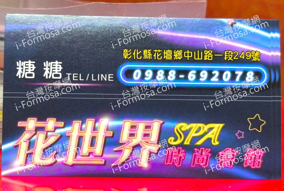 商家介紹花世界SPA時尚會館 位於彰化縣花壇鄉中山路一段,就在花南路和中山路一段這兩個路口之間的路段上。 這裡提供的服務有 全身按摩、肩頸按摩、背部按摩、指壓、油壓、泰式按摩、越式按摩、台式按摩、中式按摩、經絡按摩、中式推拿、刮痧、精油按摩、局部護理、芳療SPA、泰式SPA、被動式瑜伽。 精選照片 商家資訊 花壇鄉 所在位置: 台灣 > 中台灣 > 彰化縣 > 花壇鄉 商家類型: 養生會館 統一編號: 95310342 商業登記名稱: 花世界時尚會館 商家地址: 503台灣彰化縣花壇鄉中山路一段249號 登記營業項目: JF01020 按摩業 預約方式: 預約或現場都可 聯絡電話1: 0988692078 Line: 0988692078 服務項目: 全身按摩肩頸按摩背部按摩指壓油壓泰式按摩越式按摩台式按摩中式按摩經絡按摩中式推拿刮痧精油按摩局部護理芳療SPA泰式SPA被動式瑜伽 付款方式: 現金 停車位: 路邊停車付費停車場 地圖位置 地圖導航 No Records FoundSorry, no records were found. Please adjust your search criteria and try again. Google Map Not LoadedSorry, unable to load Google Maps API. Google評論 2.7powered by Google騰Ray12:31 06 Oct 25溫度40以上Ricky Liu16:45 09 Jul 25吳承翰09:44 18 May 25 標籤: 中式按摩、中式推拿、全身按摩、刮痧、台式按摩、局部護理、彰化按摩、彰化縣按摩、指壓、油壓、泰式按摩、泰式SPA、精油按摩、經絡按摩、肩頸按摩、背部按摩、花壇按摩、花壇鄉中山路一段、花壇鄉花南路、芳療SPA、被動式瑜伽、及 越式按摩