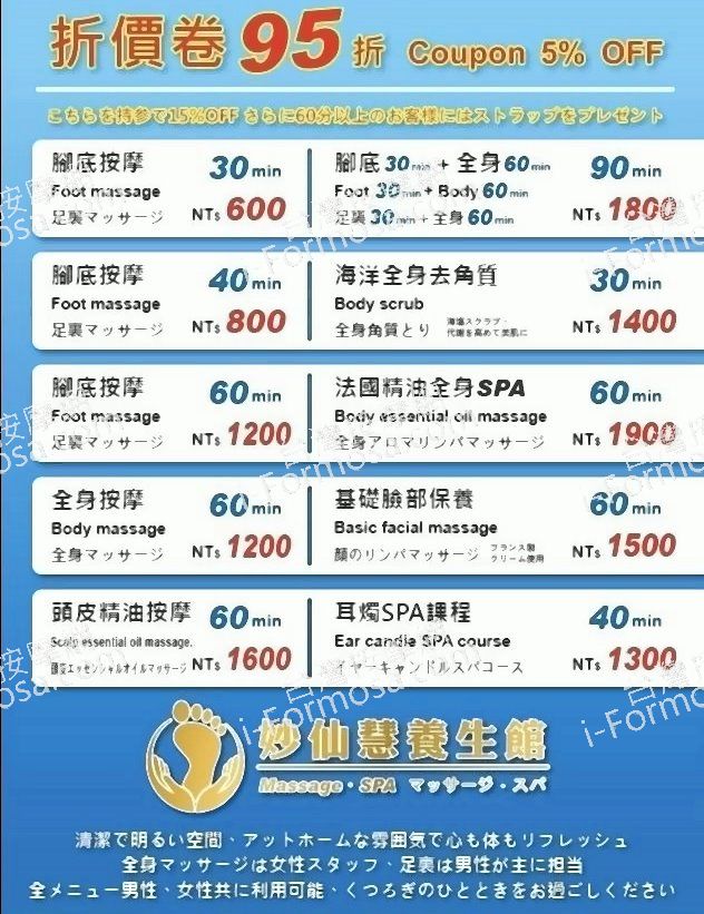 商家介紹妙仙慧養生館 位於台北市大同區承德路三段208巷,就在承德路三段和大龍街這兩個路口之間的路段上。附近地點有蘭州國中、大龍街夜市。從捷運圓山站出來再走4分鐘就可以到達本館。 這裡提供的服務有 全身按摩、腳底按摩、肩頸按摩、背部按摩、指壓、油壓、東方指壓、台式按摩、中式按摩、穴道按摩、經絡按摩、中式推拿、拔罐、刮痧、精油按摩、局部護理、臉部護膚、足湯、芳療SPA、薰香耳燭、全身去角質。 精選照片 商家資訊 大同區 所在位置: 台灣 > 北台灣 > 台北市 > 大同區 商家類型: 養生會館 統一編號: 00562743 商業登記名稱: 妙仙慧養生館 商家地址: 103台灣臺北市大同區承德路三段208巷19號 登記營業項目: JZ99080 美容美髮服務業 JZ99110 瘦身美容業 JF01040 經絡調理業 JF01010 傳統整復推拿業 JF01020 按摩業 預約方式: 預約或現場都可 聯絡電話1: 02-25361956 聯絡電話2: 0913351889 Line: 0913351889 商家網站 Facebook : 上午 11:00 - 下午 11:00週一上午 11:00 - 下午 11:00週二上午 11:00 - 下午 11:00週三上午 11:00 - 下午 11:00週四上午 11:00 - 下午 11:00週五上午 11:00 - 下午 11:00週六上午 11:00 - 下午 11:00週日上午 11:00 - 下午 11:00 服務項目: 全身按摩腳底按摩肩頸按摩背部按摩指壓油壓東方指壓台式按摩中式按摩穴道按摩經絡按摩中式推拿拔罐刮痧精油按摩局部護理臉部護膚足湯芳療SPA薰香耳燭全身去角質 服務設施: 布簾隔間 付款方式: 現金 停車位: 路邊停車付費停車場 地圖位置 地圖導航 No Records FoundSorry, no records were found. Please adjust your search criteria and try again. Google Map Not LoadedSorry, unable to load Google Maps API. Google評論 5.0powered by Google鄭椀之06:44 21 Nov 25臉部護理做得細緻,膚況變得穩定。鄭椀之(貓匠)06:41 21 Nov 25環境整潔舒適,香氛氣息讓人安心。鄭喬安06:39 21 Nov 25精油按摩讓全身都暖起來,超放鬆!Iris Huang15:12 20 Nov 25頭皮SPA後感覺清爽,精神超好邱俊閔14:14 17 Nov 25技師專業細心,按到位又不痛。 標籤: 中式按摩、中式推拿、全身去角質、全身按摩、刮痧、台北市大龍街、台北市承德路三段、台北市蘭州國中、台北按摩、台式按摩、大同區按摩、大龍街夜市、局部護理、拔罐、指壓、捷運圓山站、東方指壓、油壓、穴道按摩、精油按摩、經絡按摩、肩頸按摩、背部按摩、腳底按摩、臉部護膚、芳療SPA、薰香耳燭、及 足湯