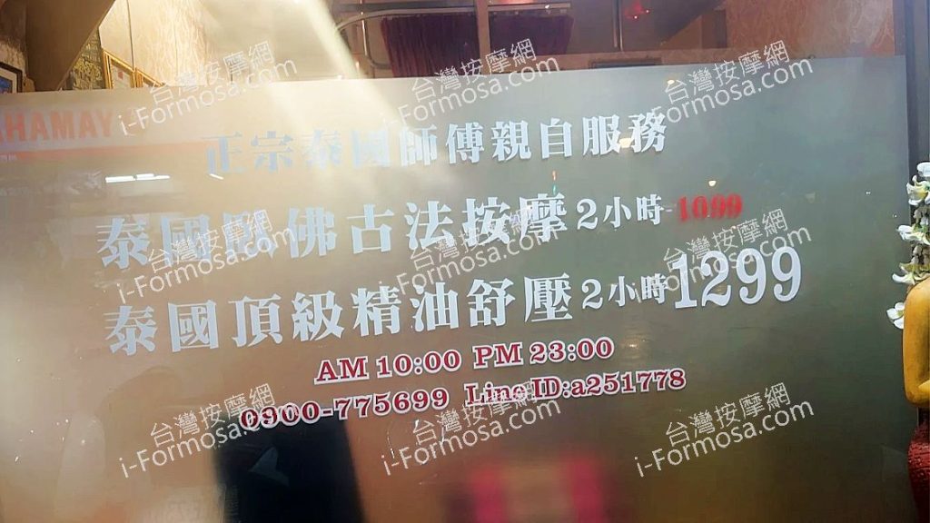這裡提供的服務有 全身按摩、肩頸按摩、背部按摩、指壓、油壓、泰式按摩、泰式古法、經絡按摩、精油按摩、芳療SPA、泰式SPA、被動式瑜伽、踩背。