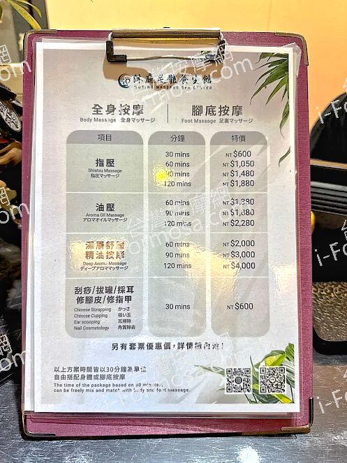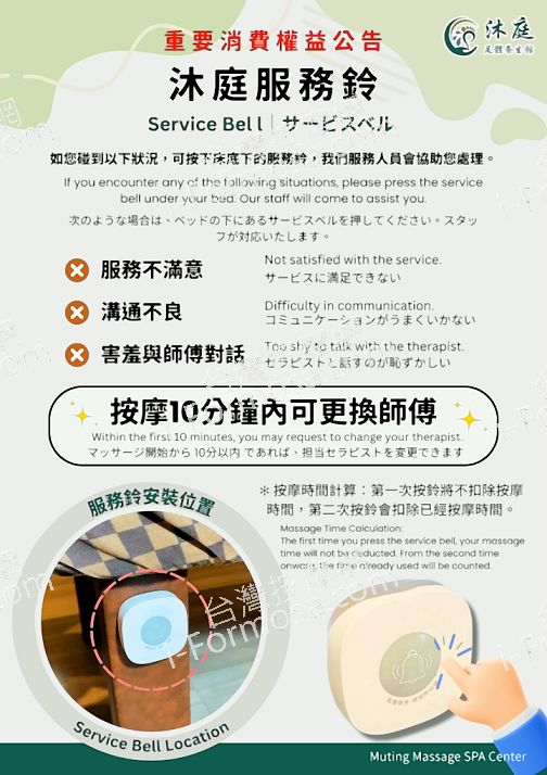 商家介紹沐庭足體養身館 位於台北市大安區建國南路一段,就在跟信義路三段交叉的路口處。附近地點有大安森林公園。從捷運大安森林公園站出來後再步行3分鐘就可以到達本館。 這裡提供的服務有 全身按摩、腳底按摩、肩頸按摩、指壓、油壓、東方指壓、台式按摩、中式按摩、經絡按摩、中式推拿、拔罐、刮痧、精油按摩、局部護理、修凍甲、修腳皮、足湯、芳療SPA、掏耳朵。 精選照片 商家資訊 大安區 所在位置: 台灣 > 北台灣 > 台北市 > 大安區 商家類型: 養生會館 統一編號: 42500111 商業登記名稱: 沐庭足體養身館 商家地址: 106台灣台北市大安區建國南路一段352號1F 登記營業項目: JF01010 傳統整復推拿業 JF01040 經絡調理業 JZ99990 未分類其他服務業 預約方式: 預約或現場都可 聯絡電話1: 02-27047666 Line(網址) 商家Email: mt352n@gmail.com Facebook Instagram : 上午 9:30 - 上午 12:00週一上午 9:30 - 上午 12:00週二上午 9:30 - 上午 12:00週三上午 9:30 - 上午 12:00週四上午 9:30 - 上午 12:00週五上午 9:30 - 上午 12:00週六上午 9:30 - 上午 12:00週日上午 9:30 - 上午 12:00 服務項目: 全身按摩腳底按摩肩頸按摩指壓油壓東方指壓台式按摩中式按摩經絡按摩中式推拿拔罐刮痧精油按摩局部護理修凍甲修腳皮足湯芳療SPA掏耳朵 付款方式: 現金 停車位: 路邊停車付費停車場 地圖位置 地圖導航 No Records FoundSorry, no records were found. Please adjust your search criteria and try again. Google Map Not LoadedSorry, unable to load Google Maps API. Google評論 4.5powered by GoogleMag kuo06:38 21 Nov 25很推薦沐庭 一個舒壓放鬆的好地方按摩師們都很專業 很到位的紓解了緊繃的身體萬益[12零]16:40 20 Nov 25今天難得體驗,1號大正師父上海市修甲,修腳皮技術精湛,慢工細活,值得立推!李佳璋08:52 20 Nov 25環境优雅,乾淨。師傅技術到位!林嘉韻10:32 19 Nov 25每次來這裡都給22號師父按摩,穴道按得很精準,力道也很夠!非常滿意👍可以指定22號師父!陳美玲09:12 10 Nov 2518號師父實在太厲害囉,他讓我的頭痛還有我的肩膀不舒服四年的不舒服,舒緩太多了超級感謝,18號師父了。真的好好,感謝喔。鄭如玲11:07 06 Nov 25今日再次來按摩發現店內的景物又更新了感覺更舒服老闆也太用心了吧!按摩師傅也超棒的👍值得推👍hua Hsu05:28 03 Nov 25推薦25號姐姐~人親切又會按!幾乎全家都來給她按了🤣🤣已經按了兩年!品質保證👍🏻不要小看女生的力氣~姐姐力道很夠喔!!fion chen04:49 24 Oct 25第一次到訪,22號師傅按摩功夫到位,按完整個疲憊感都消除了,值得推薦Doris Wu09:15 07 Oct 25交通方便、價格公道的按摩店👍捷運搭到大安森林公園站從6號出口走3分鐘左右就可以到達🙂今天體驗全身按摩60分鐘,幫我按摩的師傅經驗很夠,全程都會關注我的舒適度及力道,60分鐘的體驗全身+頭部的筋絡都得到很好的舒展及放鬆,按摩完後會提供小點心,今天是銀耳湯(看網評之前好像也有綠豆湯)。總之可以感受到是一個用心經營的店家,不是那種一般的觀光按摩店,在地小店沒想到體驗到很棒的服務,讚讚的👍 標籤: 中式按摩、中式推拿、修凍甲、修腳皮、全身按摩、刮痧、台北市信義路三段、台北市建國南路一段、台北按摩、台式按摩、大安區按摩、大安森林公園、局部護理、拔罐、指壓、捷運大安森林公園站、掏耳朵、東方指壓、油壓、精油按摩、經絡按摩、肩頸按摩、腳底按摩、芳療SPA、及 足湯